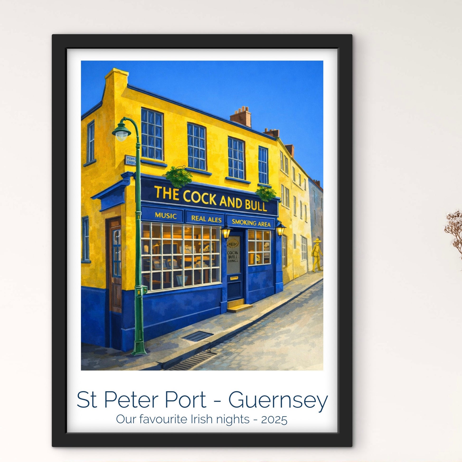 Step back to a simpler time with this retro travel poster celebrating the Coco and Bull, one of Guernsey's much-loved social spaces. Inspired by the golden age of 1950s travel posters, this artwork captures the spirit of good conversation, familiar places, and the pleasure of slowing down.