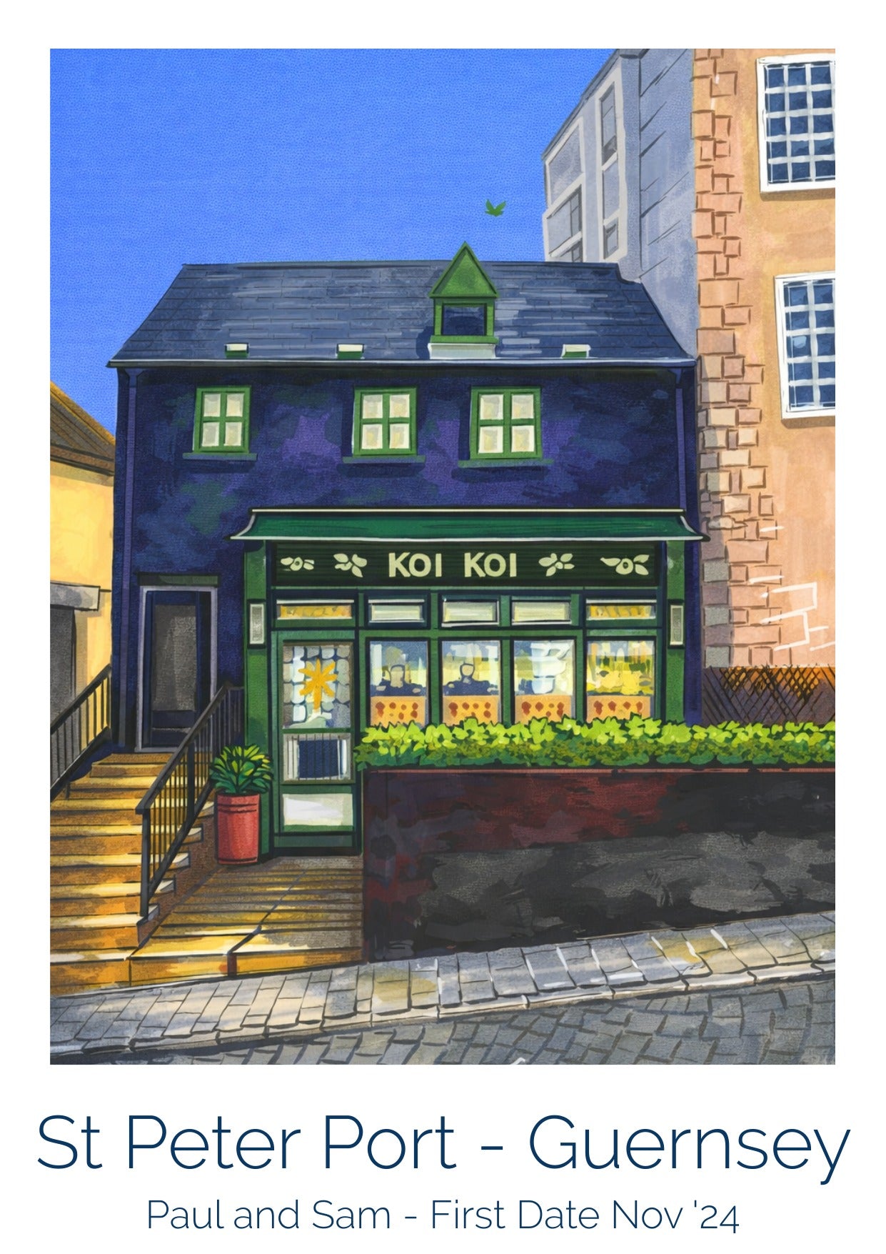 Step back to a simpler time with this retro travel poster celebrating Koi Koi, one of Guernsey's much-loved local social spaces. Inspired by the golden age of 1950s travel posters, this artwork captures the spirit of good conversation, familiar places, and the pleasure of shared spaces with friends.