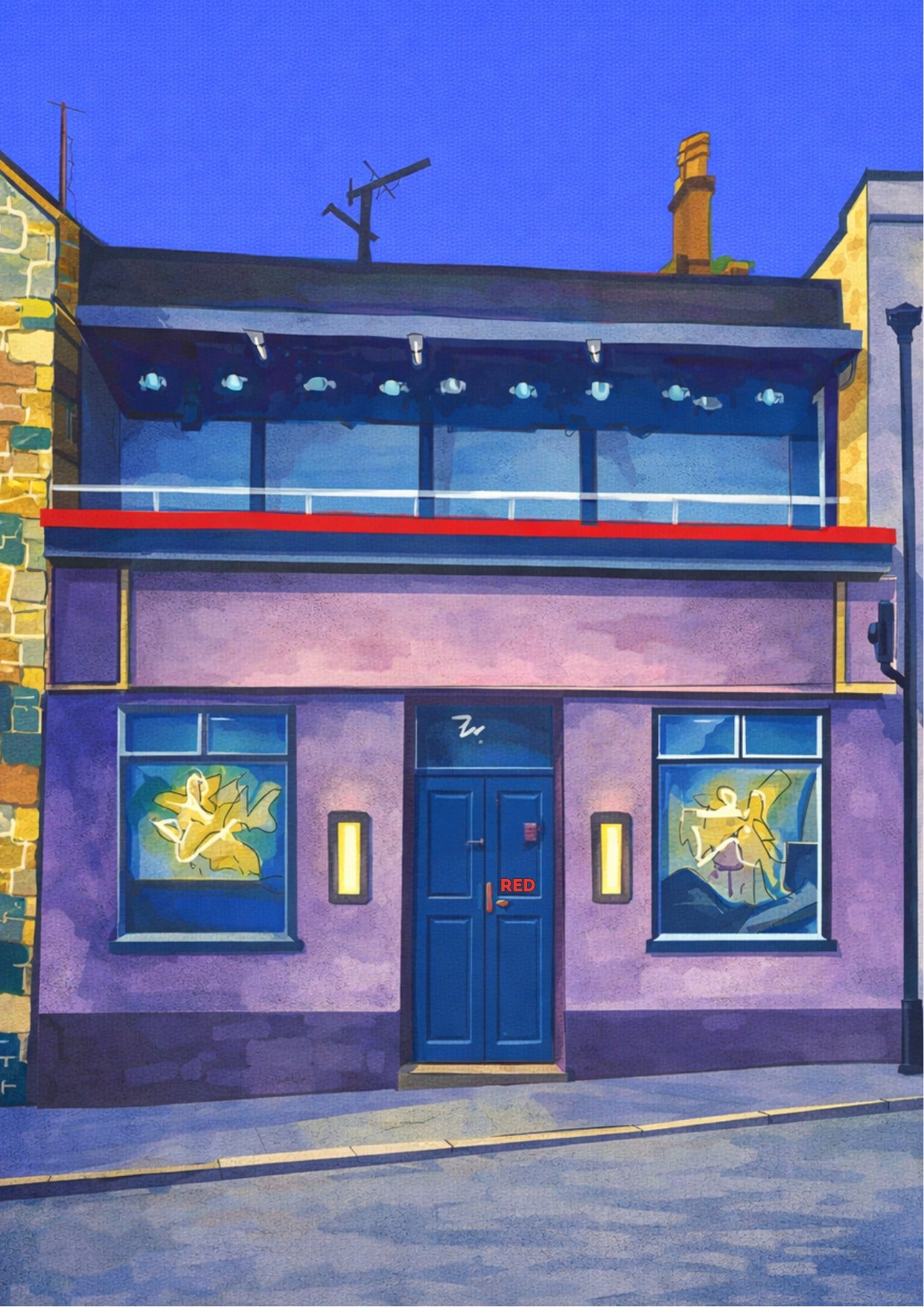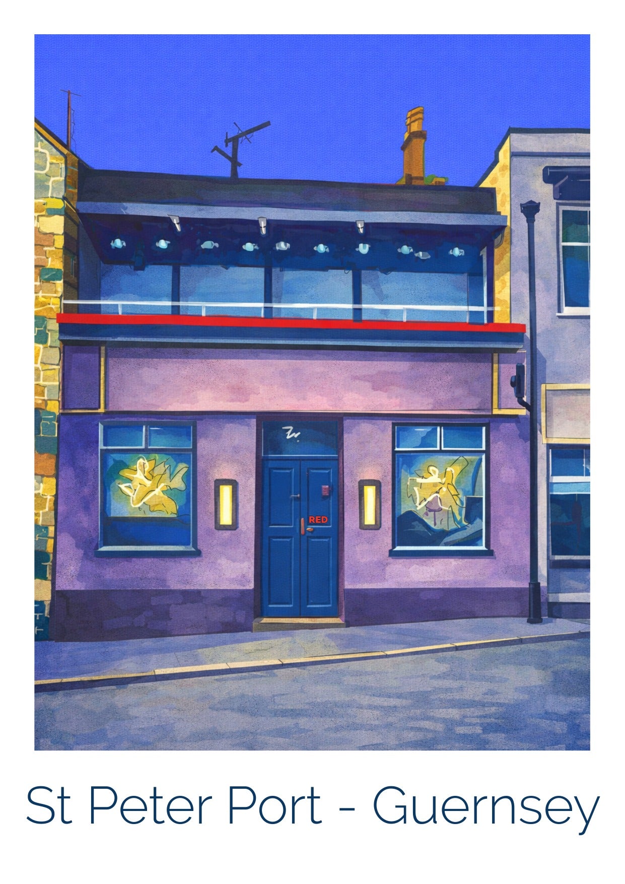 Step back to a simpler time with this retro travel poster celebrating Red, one of Guernsey's much-loved local social spaces. Inspired by the golden age of 1950s travel posters, this artwork captures the spirit of good conversation, familiar places, and the pleasure of shared spaces with friends.