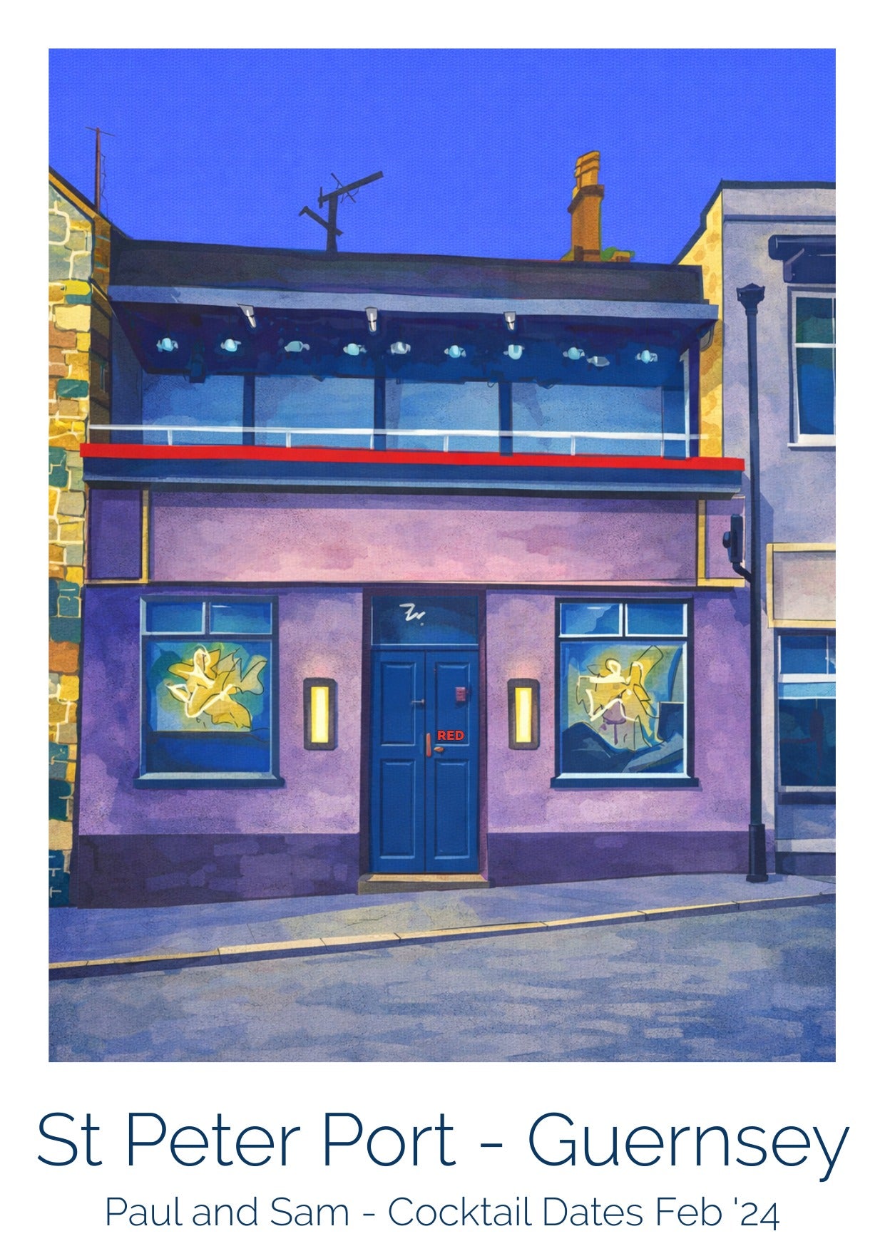 This graphic design evokes memories of favourite pubs, bars, and restaurants, rendered in a warm, nostalgic style that invites you in. Each piece in the series celebrates Guernsey's social heart — places that matter, moments worth remembering.