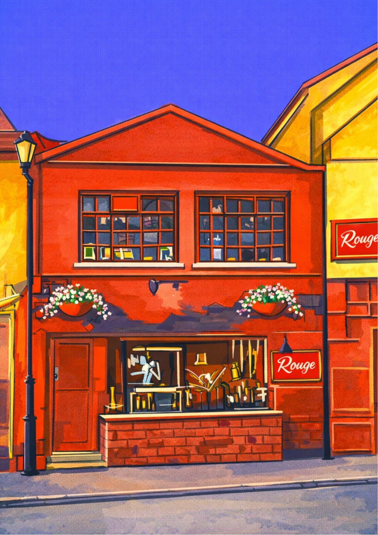 Step back to a simpler time with this retro travel poster celebrating Rouge, one of Guernsey's much-loved local social spaces. Inspired by the golden age of 1950s travel posters, this artwork captures the spirit of good conversation, familiar places, and the pleasure of shared spaces with friends.