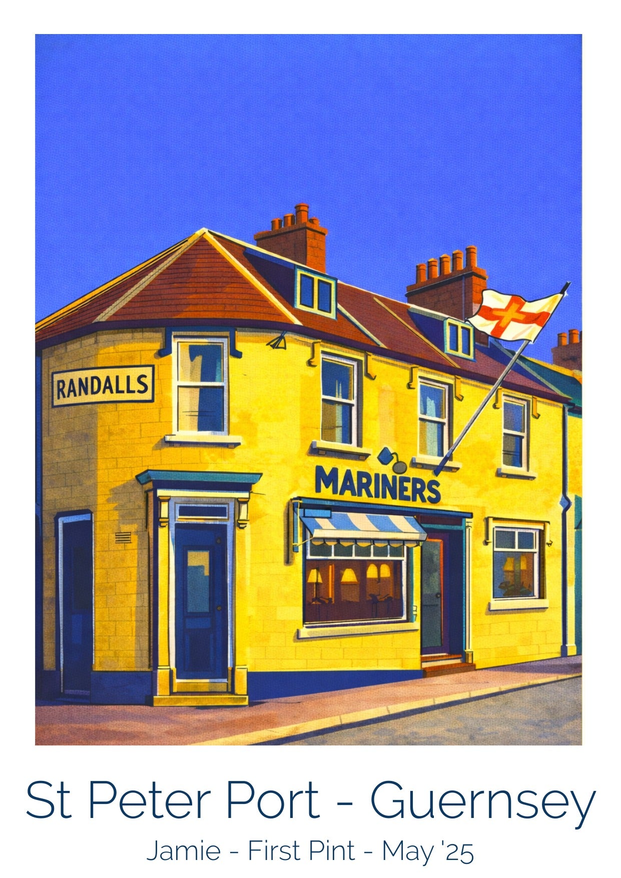 Step back to a simpler time with this retro travel poster celebrating The Mariners, one of Guernsey's much-loved local social spaces. Inspired by the golden age of 1950s travel posters, this artwork captures the spirit of good conversation, familiar places, and the pleasure of shared spaces with friends.
