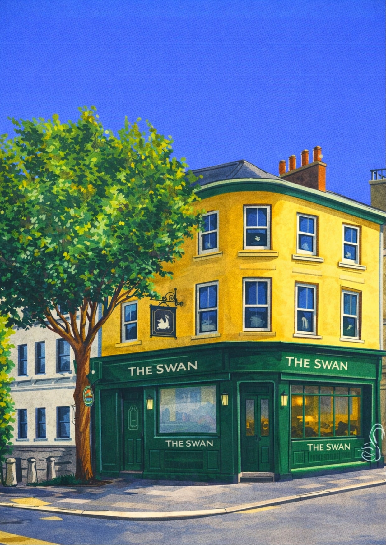 Step back to a simpler time with this retro travel poster celebrating The Swan,one of Guernsey's much-loved local social spaces. Inspired by the golden age of 1950s travel posters, this artwork captures the spirit of good conversation, familiar places, and the pleasure of shared spaces with friends.